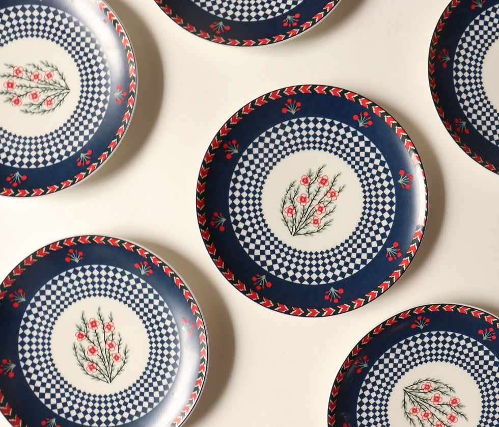 Inspired by the traditional Indian Textiles, floral motifs are hand drawn in oriental from. Simple squares are interlaced to create a repeating hypnotic pattern in few areas that adds a beautiful contrast to the flowers. The design is hand screen printed on fine porcelain.